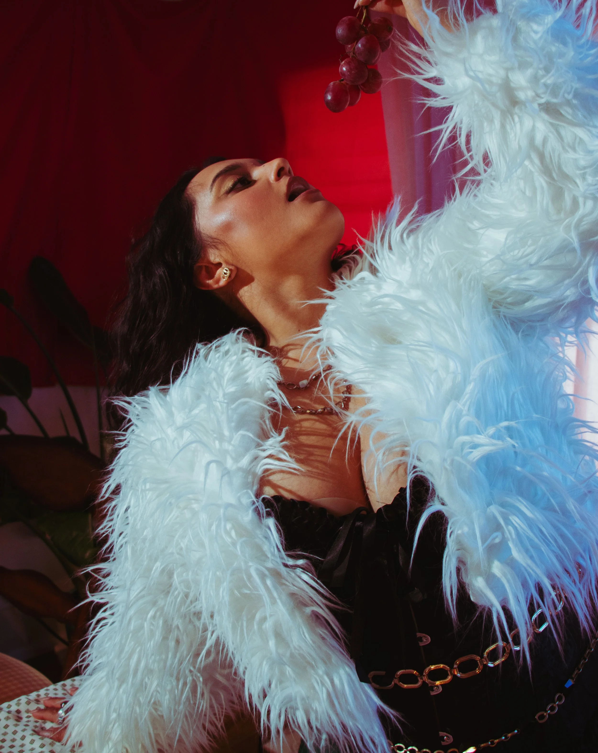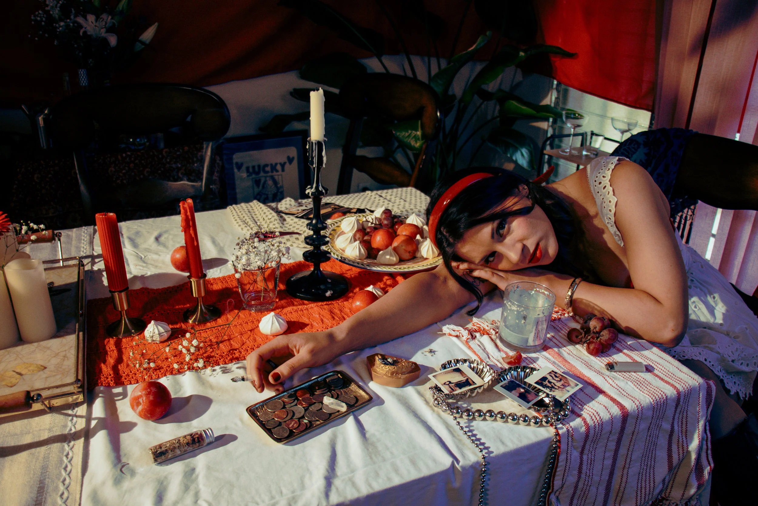 A spiral of smoke swirls behind a red satin curtain. Behind it a woman puffs a dimly lit cigarette, she notices you and asks if you want to take a drag. You accept and she welcomes you beyond the red and satin - where you find yourself at a GIRL DINNER. It’s an oasis of womanhood, women lavishing in each other’s company, dressing for themselves and taking up all the space in the room. They usher you to take a seat at or under the table, and praise that you to come as the loudest, chaotic, colorful and unapologetically feminine version of yourself. Don’t just stand there, go on - join them.